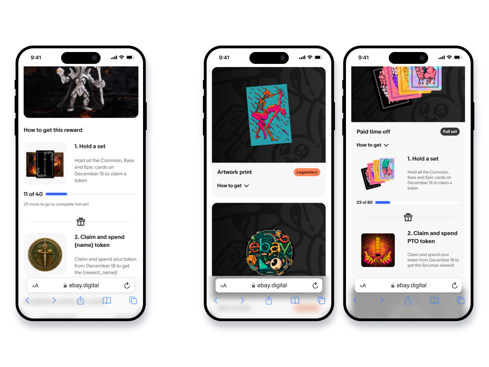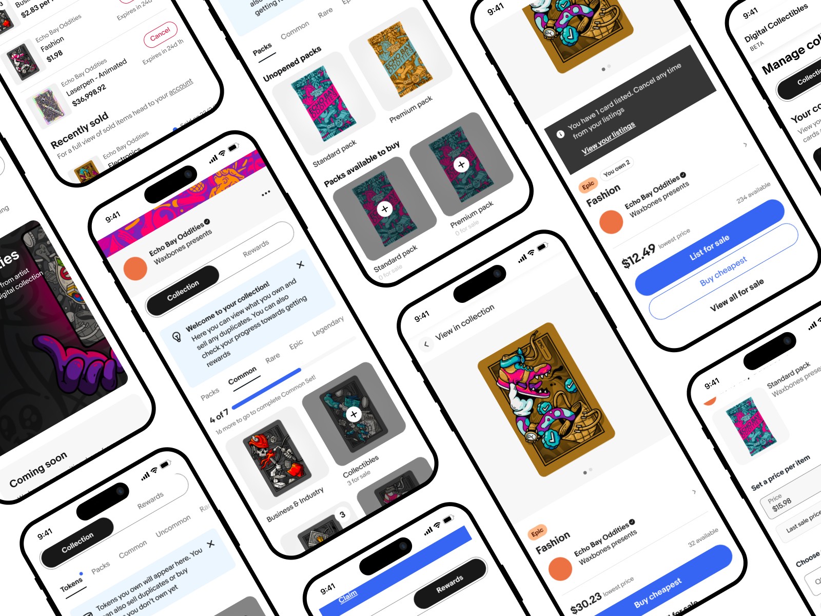 Ebay has a thriving collectibles category accounting for about $10 billion GMV in 2023. After seeing multiple brands such as Funko, Topshot and Hotwheels enter the Web3 Collectibles market, eBay saw an opportunity to launch a proposition of their own in the form of a Digital Collect & Reward platform. This would be based around users collecting digital trading cards from popular brand IPs and artists in order to claim physical rewards. My task was to focus on designing the collections, trading and rewards areas whilst working closely with the rest of the design team to align on the end-to-end experience of the overall platform.