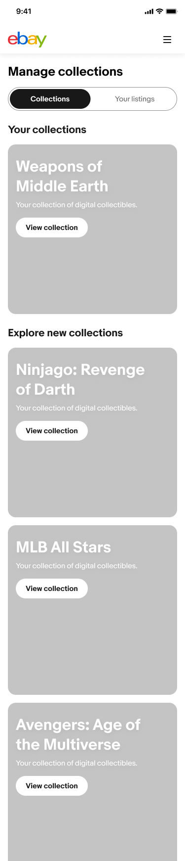 Leading the Collections squad for eBay’s Web 3 Collect and Reward platform was an incredibly challenging yet rewarding experience. The project involved overseeing critical user interactions, such as buying missing cards, listing duplicates, tracking progress toward rewards, and managing card inventories. Leading sprints to address these complex design challenges, particularly with blockchain parameters like ERC-721s and ERC-1155 tokens, sharpened my ability to come up with intuitive solutions for the end user that were technically compatible.